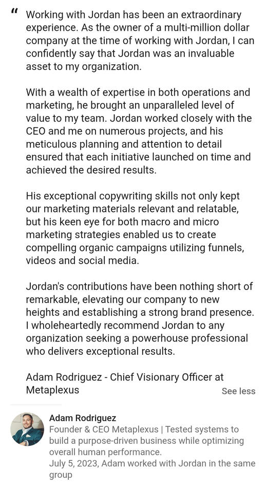 Hey I’m Jordan, and I help 6- & 7-figure business coaches increase their deliverability & 2–3X the profits from their email list.A fun fact about me: I’m a football (soccer) supporter of a Premier League team, but I won’t say which one since you might automatically want to throw profanity my way (or not) based on who I support.Check out some of my testimonials and samples on here, and if you’re ready, I’m looking to take on one more client this month who wants to unlock more profit from their list.Email me at [email protected] and let’s chat :)
